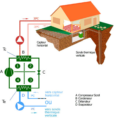 L’énergie contenue dans le sol est ainsi récupérée pour assurer le chauffage et le rafraîchissement de l’habitation.